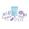 Contenido: 2 esmaltes de uñas, Paleta de brillo de 8 colores, Bolsa de maquillaje, 1 bote de brillo de labios, 3 barras de labios, 1 bálsamo labial, 1 aplicador de sombra de ojos, Unos polvos con brillo, 1 anillo, 2 gomas para el cabello, 1 espejo, 1 pincel de labios, 1 lima de uñas, 1 divisor de dedos, 1 peine de pelo, 1 pegatina.