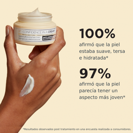¿QUÉ HACE?Confidence in a Cream es una crema antiedad hidratante de rápida absorción y clínicamente testada, que mejora el aspecto de la piel y es apta para todo tipo de pieles.