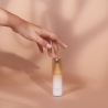 Por la mañana o por la noche, aplica media dosis en el contorno de ojos con suaves toques con las yemas de los dedos.
