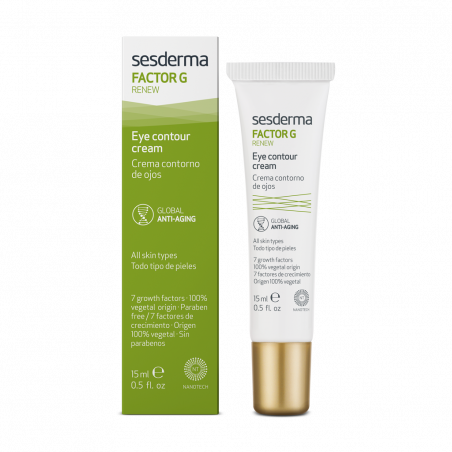 Crema anti edad para la zona del contorno de ojos, formulada con biotecnología. 7 factores de crecimiento de origen vegetal, para reactivar los mecanismos de regeneración de la piel y un complejo de activos que actúan sobre las ojeras. Factor G Renew multiplica por 3 la síntesis de colágeno y elastina, para la reducción de las arrugas.