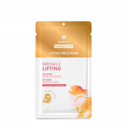 La Mascarilla facial Lifting Gold Mask de Sesderma es una máscara para recuperar la firmeza con 3 capas de pan de oro que ayuda a la absorción de sus activos que reafirman la piel y le retornan la elasticidad.