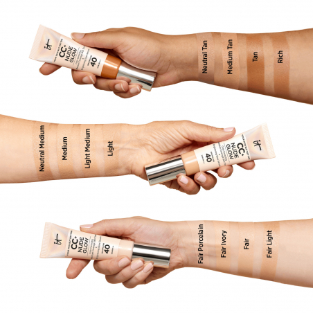 Desarrollada con cirujanos estéticos y dermatólogos, CC+ Nude Glow de iT COSMETICS ofrece una cobertura media proporcionando a tu piel un acabado luminoso, cuida tu piel con un tratamiento antiedad e hidratante y la protege gracias a su filtro solar de amplio espectro con SPF 40+ UVA/UVB.