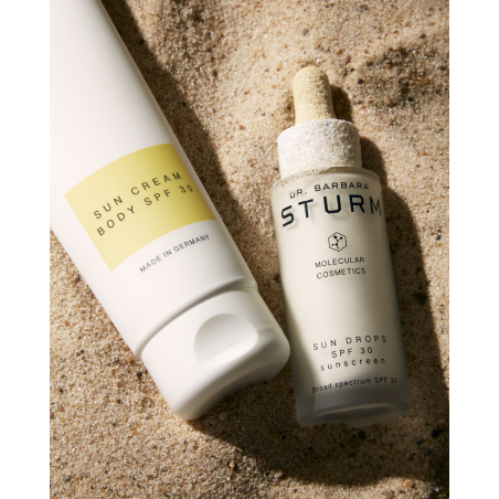 Siguiendo la ciencia de su fórmula patentada de suero solar para el rostro, SUN DROPS SPF50 y SPF30, la Dra. Barbara Sturm presenta un nuevo enfoque de 360° para el cuidado solar para el resto de el cuerpo. SUN CREAM BODY SPF 30 combina una protección de amplio espectro frente a los rayos UVA/UVB con potente ciencia de ingredientes que apoya la protección de la piel contra los rayos infrarrojos y Luz HEV para una piel más firme, suave y juvenil de pies a cabeza.