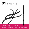 Twist'matic Kajal, el lápiz automático 2 en 1: delineador y lápiz con sacapuntas integrado que se adapta al contorno del ojo y a su interior para un delineado más preciso y sin manchas.
