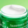 INGREDIENTS : AQUA/WATER, BUTYROSPERMUM PARKII (SHEA) BUTTER, SIMMONDSIA CHINENSIS (JOJOBA) SEED OIL, SQUALANE, BEHENYL ALCOHOL, GLYCERIN, GLYCERYL STEARATE CITRATE, DICAPRYLYL ETHER, CETEARYL ALCOHOL, LAUROYL LYSINE, PENTYLENE GLYCOL, PARFUM/FRAGRANCE, MICROCRYSTALLINE CELLULOSE, PERSEA GRATISSIMA (AVOCADO) OIL, SODIUM STEAROYL GLUTAMATE, ETHYLHEXYLGLYCERIN, XANTHAN GUM, HYALURONIC ACID, ROSA CANINA FRUIT OIL, SODIUM GLUCONATE, MEDICAGO SATIVA (ALFALFA) EXTRACT, CELLULOSE GUM, 1,2-HEXANEDIOL, CAPRYLYL GLYCOL, HEMEROCALLIS FULVA EXTRACT, CITRIC ACID, TROPOLONE, TOCOPHEROL, LINALOOL, COUMARIN, HYDROXYCITRONELLAL, GERANIOL, CITRONELLOL [N5703/A] Fruto de varios años de investigación científica del laboratorio NUXE, la gama Nuxuriance Ultra supera los límites de los tratamientos antiedad con una innovación de vanguardia. En el corazón de las fórmulas, la nueva TECNOLOGÍA ALFA [3R] es un potente trío de activos antiedad más eficaz que el retinol: - Extracto de semillas de Alfalfa cultivadas en Francia según los métodos de la agricultura ecológica - Ácido Hialurónico natural - Extracto de Hemerocallis obtenido por oleo-eco-extracción. Fórmula vegana sin ingredientes ni derivados de origen animal. 97% de ingredientes de origen natural. 3 PATENTES NUXE