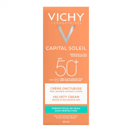 Vichy Crema untuosa perfeccionadora de piel. Muy alta protección UVB/UVA para el rostro. Piel sensible normal a seca. Fórmula ultra-hidratante 24h con un acabado suave y sedoso. Resistente al agua. Bronceado luminoso, piel lisa y uniforme.