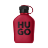 El frasco de HUGO INTENSE se presenta en rojo, con un acabado efecto hormigón y un atrevido logotipo negro, y se cierra con un llamativo tapón negro y una correa de tela roja para realzar aún más la intensidad.