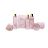 Incluye un gel de baño, espuma de baño, sales de baño, un body mist, loción corporal, exfoliante corporal y una esponja con aroma a vainilla y coco.