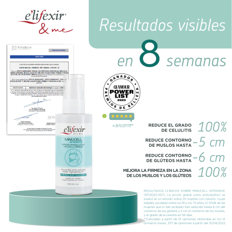 Elifexir Dermo Minucell Intensive Aceite es un potente aceite reductor anticelulítico que combate la piel de naranja ejerciendo un efecto triple acción: anticelulítico, drenante y reafirmante que embellece la piel.