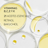 - Explosión de Vitaminas: Acción conjunta de vitaminas que estimula la producción de colágeno y de ácido hialurónico. Gran poder antioxidante. Piel luminosa y uniforme.