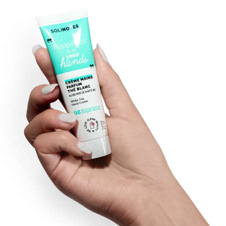 Solinotes Thé Blanc Crema de Mano. Disfrute de una experiencia sensorial con la crema de manos Té Blanco, que le llevará a una escapada refinada con sus notas frescas y almizcladas, delicadamente rejuvenecedoras.