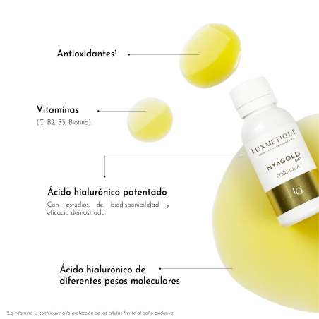 Luxmetique Hyagold Day Formula. Nutricosmético bebible con la máxima concentración de ácido hialurónico diurno, para hidratar todas las capas de la piel.