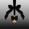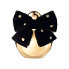Cubierto con un acabado dorado espejado, el emblemático envase de Nina en forma de manzana está adornado con un lazo de terciopelo negro y lunares dorados inspirados en las últimas creaciones de moda de Harris.