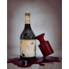 Manchas de vino púrpura se extienden por las páginas de un viejo diario de cuero, impregnando el papel con marcas vívidas e irregulares.