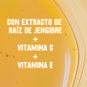 Con extracto de raíz de jengibre + Vitamina C, que actúan para igualar el tono.
