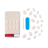 APLICACIÓN: 1. Aplica pegamento en la parte posterior de la uña postiza. 2. Aplica pegamento en la uña natural. 3. Alinea con la cutícula, presiona y mantén 5 segundos. 4. Cuando la uña esté segura, rompe la pestaña.