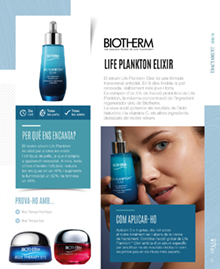 TRATAMIENTO SERUM Día y noche Todas las pieles Todas las edades LIFE PLANKTON ELIXIR El serum Life Plankton Elixir es una fórmula transversal antiedad, teniendo en 8 días tu piel renovada, visiblemente más joven y fuerte. Se compone de un 5% de Fracción Probiótica de Life Plankton, la máxima concentración del ingrediente regenerador único de Biotherm. Su acción potencia los resultados del ácido hialurónico y la vitamina C, los otros ingredientes destacados de nuestro sérum. ¿POR QUÉ NOS ENCANTA? Nuestro serum Life Plankton es válido para todas las edades y todo tipo de pieles, adaptándose a cualquier necesidad. Además, test clínicos avalan su eficacia, reduciendo las arrugas en un 46%, aumentando la luminosidad un 52% y la firmeza un 48%. PRUÉBALO CON... Blue Therapy Red Algae Blue Therapy Eye CÓMO APLICARLO Aplica 3 o 4 gotas, día y noche sobre el rostro totalmente limpio y antes de la crema de tratamiento. Combina la acción global de Life PlanktonTM Elixir con la de un suero específico para amplificar sus resultados, incluyéndolo como primer paso en los rituales más expertos. 21