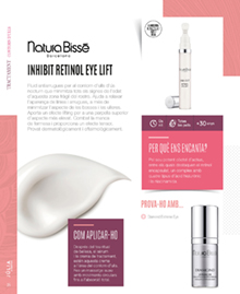 26 INHIBIT RETINOL EYE LIFT Fluido antiarrugas para el contorno de los ojos de uso nocturno, que minimiza todos los signos de la edad de esta frágil zona del rostro. Ayuda a relajar la apariencia de líneas y arrugas, así como minimiza el aspecto de bolsas y ojeras. Aporta un efecto lifting para un párpado superior de aspecto más elevado. Combate la falta de firmeza y proporciona un efecto tensor. Dermatológica y oftalmológicamente testado. Uso Todas noche las pieles TRATAMIENTO CONTORNO DE OJOS CÓMO APLICARLO Tras tu ritual de limpieza, serum y crema de tratamiento, extiende esta crema en el área del contorno de ojos. Masajea suavemente con movimientos circulares hasta su total absorción. 30años ¿POR QUÉ NOS ENCANTA? Por su potente cóctel de activos entre los que figuran retinol encapsulado, un complejo con 4 tipos de ácido hialurónico y la niacinamida. PRUÉBALO CON... Diamond Extreme Eye