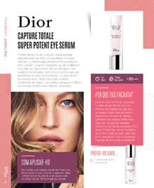 TRATAMIENTO CONTORNO DE OJOS 28 CAPTURE TOTALE SUPER POTENT EYE SERUM Potente serum de ojos antiedad ultra sensorial, compuesto por un 92% de ingredientes de origen natural. La tecnología procedente de la longoza (Bio Celular Longoza Complex) ayuda a relanzar el poder de regeneración de las células madre cutáneas actuando como una onda de energía para revitalizar la zona de la mirada. Su acción se refuerza con el ácido hialurónico acetilado y el extracto de centeno. Las arruguitas se alisan, la mirada parece más abierta y despierta. Uso Todas diario las pieles CÓMO APLICARLO Para revelar una mirada visiblemente más joven, utilízalo por la mañana y por la noche. El aplicador alisa y refresca la zona gracias a sus olas en relieve y al choque térmico inducido por el zamac. 30años ¿POR QUÉ NOS ENCANTA? Tras 1 minuto de masaje y a lo largo de las aplicaciones, los efectos son visibles sobre la relajación de los músculos faciales. Asociada a una herramienta de última generación de diseño doblemente patentado y un gestual exclusivo desarrollado por las facialistas Dior, Super Potent Eye Serum revitaliza el contorno de los ojos, luciendo más firme, energizado y descongestionado. El poder de la mirada se potencia. PRUÉBALO CON... Capture Totale Super Potent Serum
